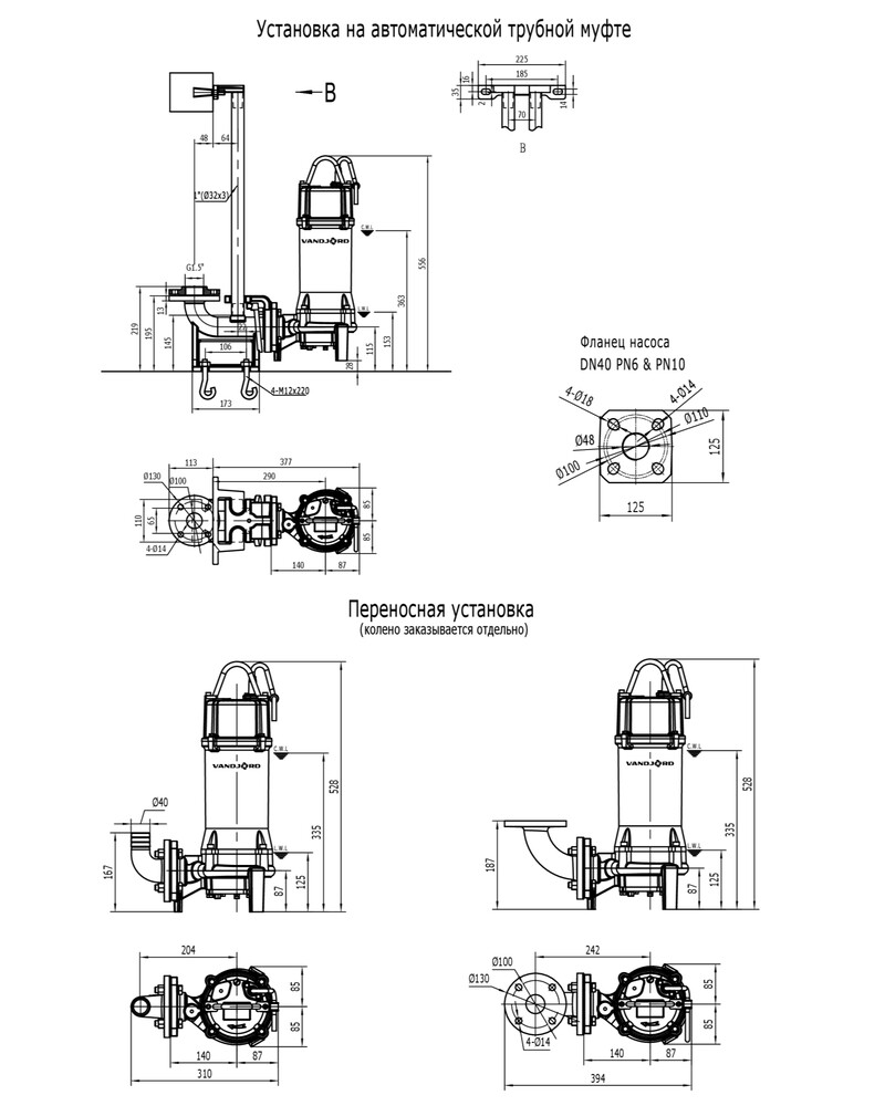 Поставляется с кабелем 10 м со свободным концом. Возможно изготовить другую длину кабеля по отдельному запросу. Возможны следующие варианты монтажа: свободная переносная установка или установка на автоматической трубной муфте. Насосы, поставляемые без поплавкового выключателя, должны комплектоваться шкафом управления Vandjord LCV или шкафом с аналогичными функциями.