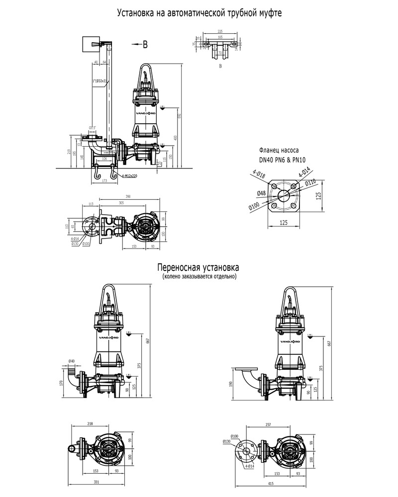 Поставляется с кабелем 10 м со свободным концом. Возможно изготовить другую длину кабеля по отдельному запросу. Возможны следующие варианты монтажа: свободная переносная установка или установка на автоматической трубной муфте. Насосы, поставляемые без поплавкового выключателя, должны комплектоваться шкафом управления Vandjord LCV или шкафом с аналогичными функциями.