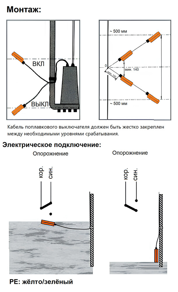 Vandjord KR1 S – высокотемпературный дренажный поплавок круглой формы типа «лягушка». С контактом, либо на опорожнение, либо на заполнение. Утяжелитель отсутствует. Поплавок плавает на поверхности, уровень срабатывания и разница уровней включения и выключения регулируется длиной свободного конца кабеля.